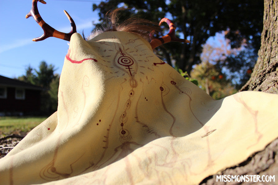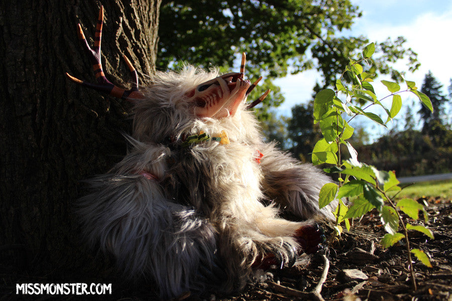 This is a one of a kind, hand made art doll. The face, antlers, claws and feet are cast from original sculpts are are made of urethane. Each piece is hand painted with a hand sewn faux fur body. This is a floppy style doll with no armature. It is stuffed with soft polyfill. Glass eyes. The head also glows purple in the dark! Chime's mohawk is made from goat hair and he has a removable soft leather cloak.