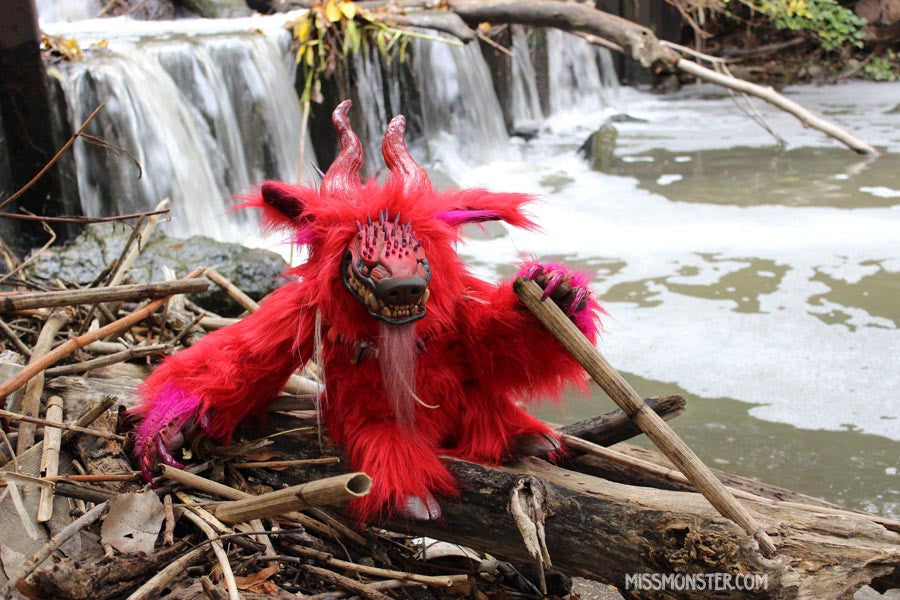 This is a one of a kind, handmade doll. His face, horns and claws/hooves are cast in urethane and hand painted. The body is soft faux fur with no articulation. His goatee is made from goat hair.
