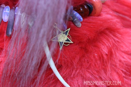 Boazar has a real python rib bone on his necklace ( id like to say it's from his last meal but in reality it was ethically harvested from a pet who dies of natural causes) , along with an ammonite and an enamel star medal from a Shinto temple. His necklace is also made from anemone spines, amber beads, glass and wood.