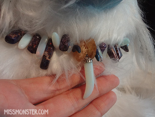 This doll's necklace is made from awesome Jasper beads, glass opal beads and raw African amber chunks.