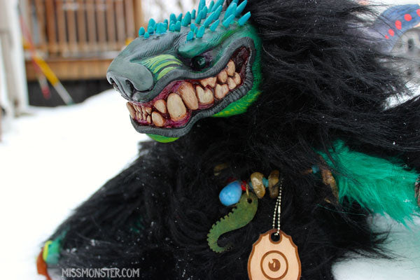 Minglesnout's necklace is made from bison teeth, glass opalite, African amber chunks, and a leather tentacle.