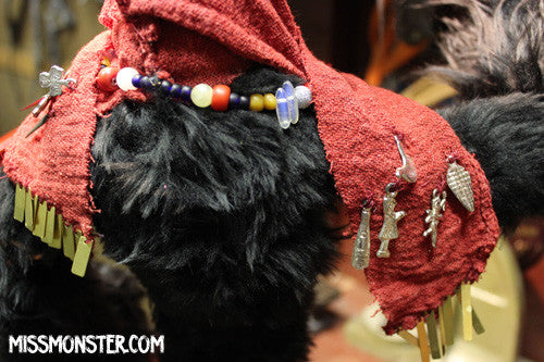 Ms. Blackwoods scarf is made from cotton with pewter milagros charms, brass accents, a cast bird skull from Skullery and other metal accents. It also features an antique enamel pin from a Shinto shrine. The scarf is not removable. Her necklace is made from glass, fossil shark tooth, fossil garfish scale, amber and semi precious stone.