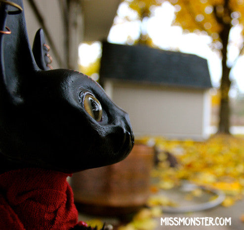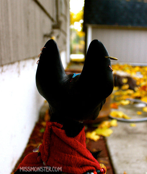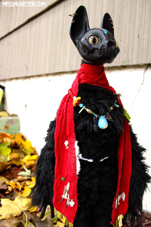 This is my friend Ms. Blackwood. She is a wise witch monster lady who travels the world helping needy people. She travels in the form of a black mist at night listening for whispered prayers and pleas for help. Ms. Blackwood uses her magic or her smarts to solve these problems or at least get things set in motion to come to a good end. Each one of the objects on her traveling scarf represents a problem she helped solve... heart charm for a lost child, a stomach charm for a healed sickness, etc. Ms. Blackwood would like to find a new place to stay if you can help her out!