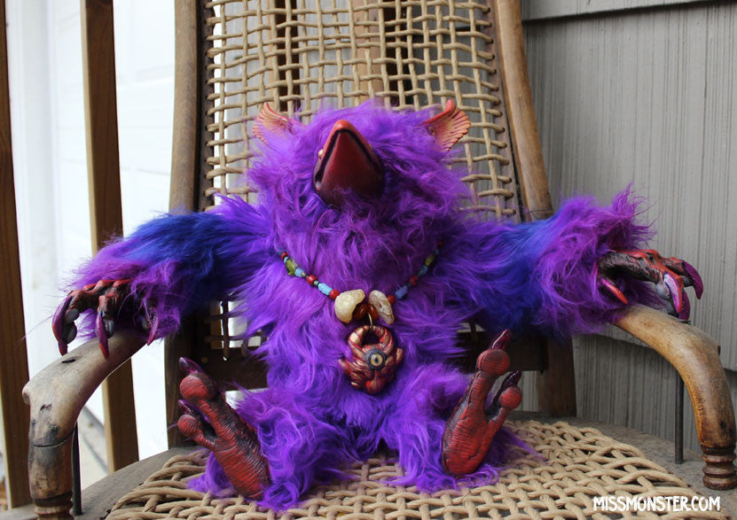 Each Grimmun has an essence: Purkoy's is flame. She's a fun, cheerful little sprite but is also very protective of the people who come into her forest. She will warm lost travelers during cold nights. Purkoy also loves to preen her human pals and LOVES to preen beards with her long beak. Her favorite offering is marmalade.