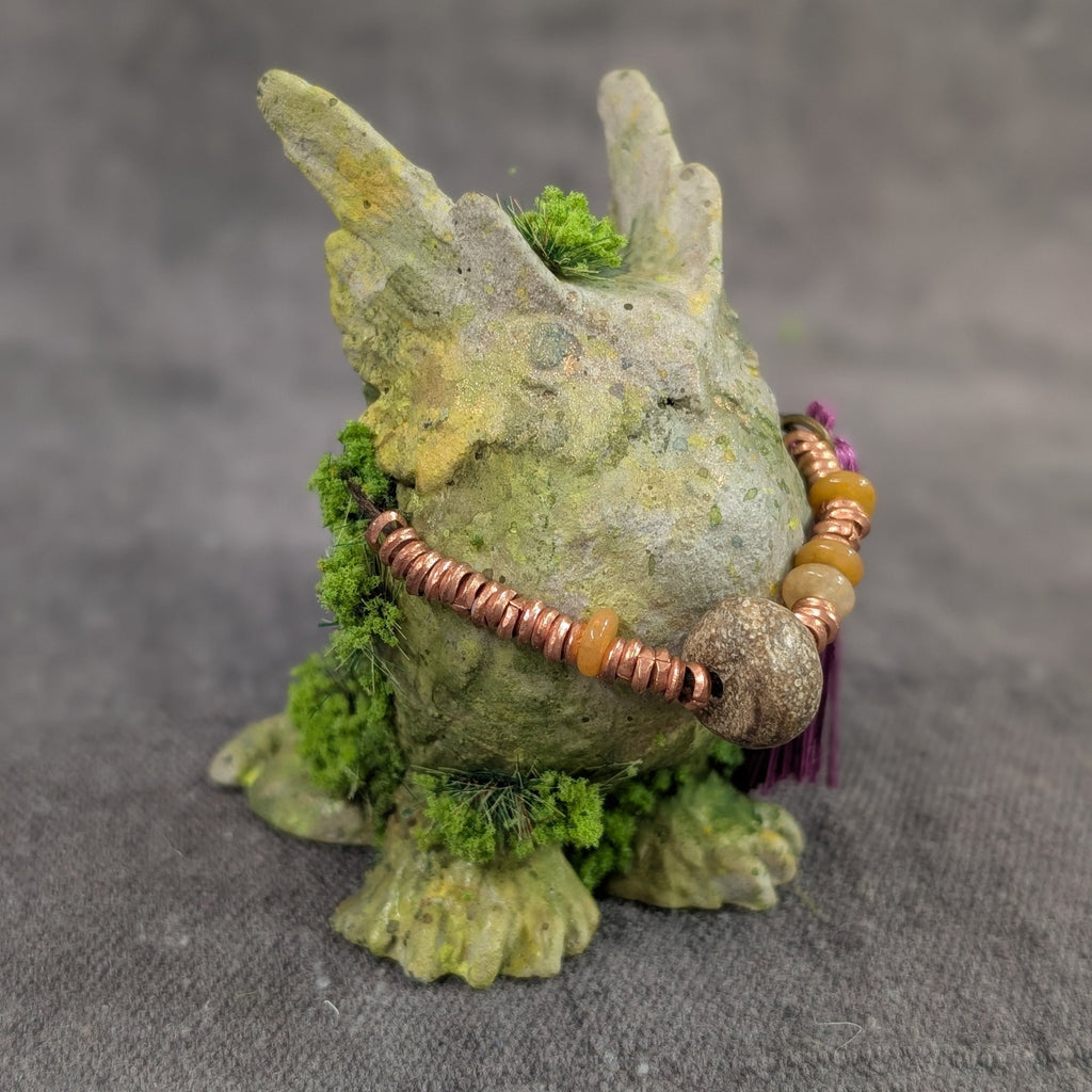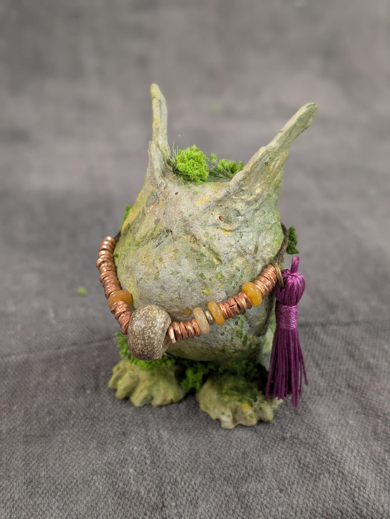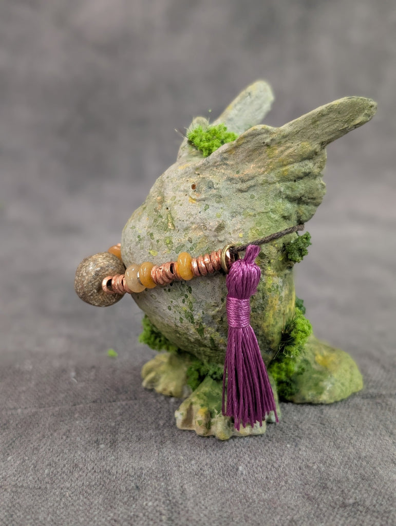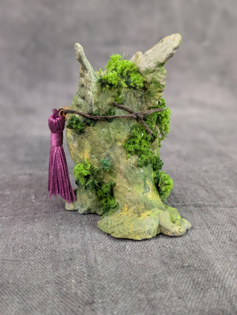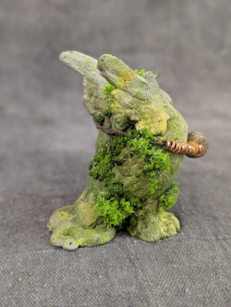 This 3" cast urethane figure was originally sculpted by hand using clay. It has been coated with a ston surface and painted to look like an old mossy relic. Though this looks like stone, please display it indoors and treat it gently.