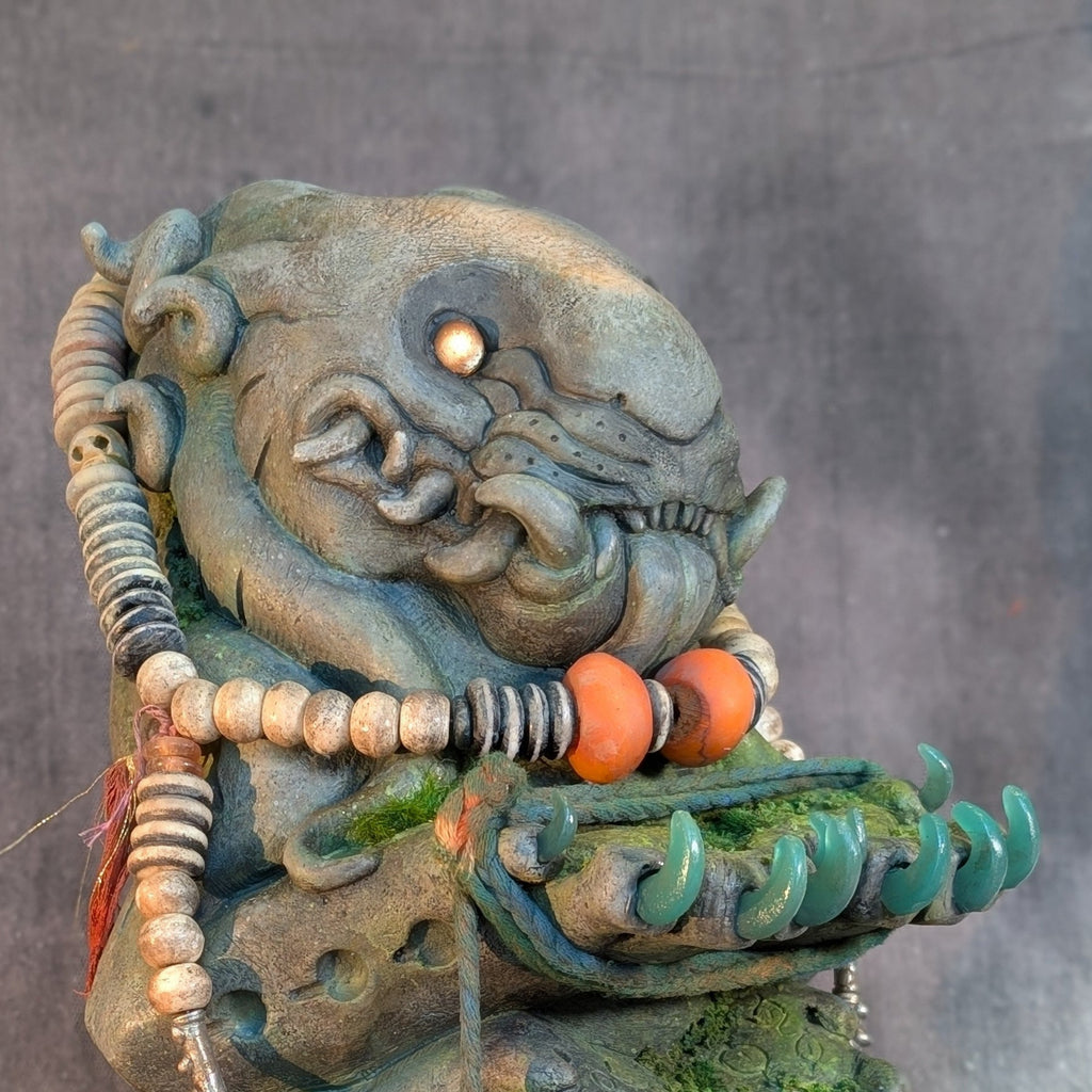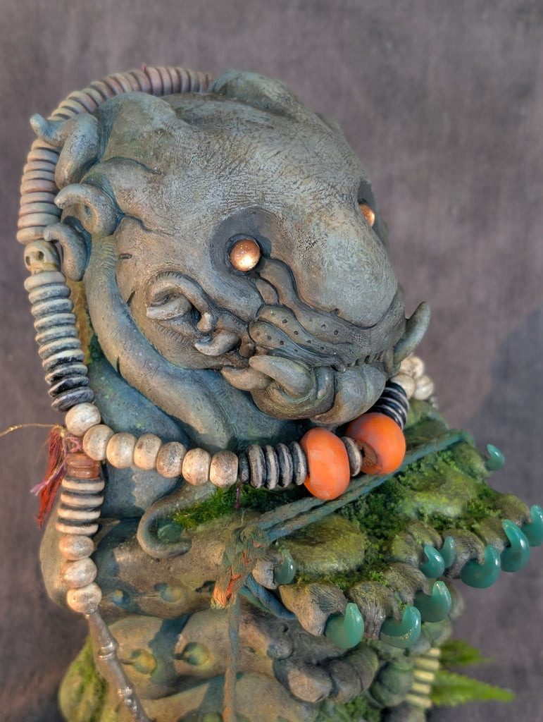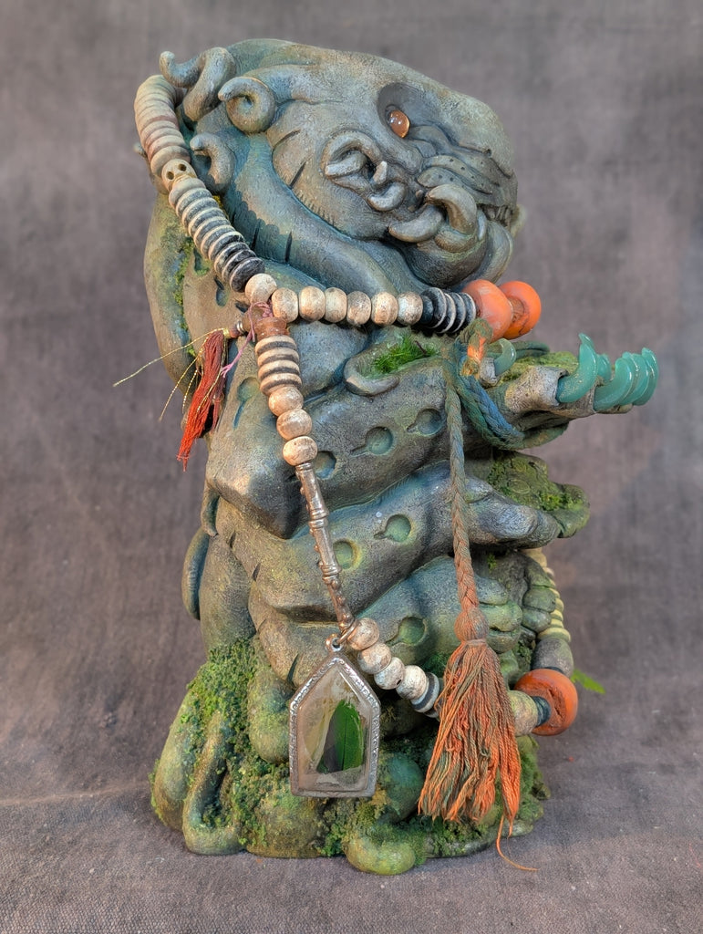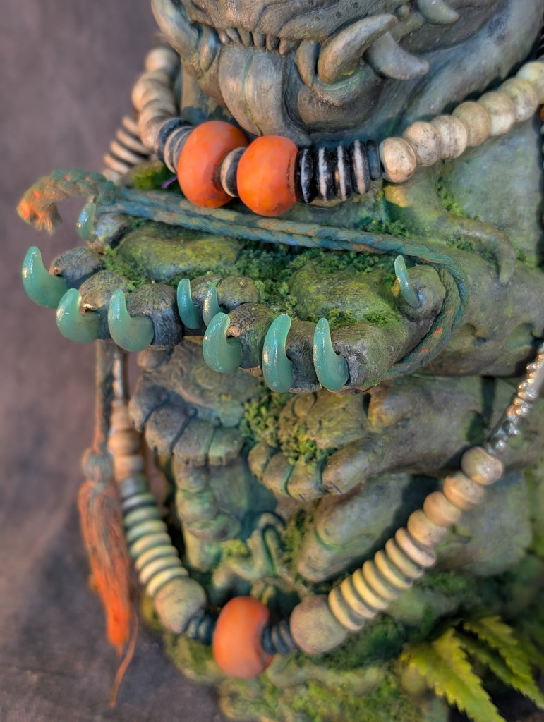 The Waypoint Watcher is a 12" urethane hollow cast. It has been sculpted to look like stone but is not actual stone. This is a finished sculpture that is hand painted and decorated with faux moss/fern accents. The necklaces are made from bone, wood and glass beads.