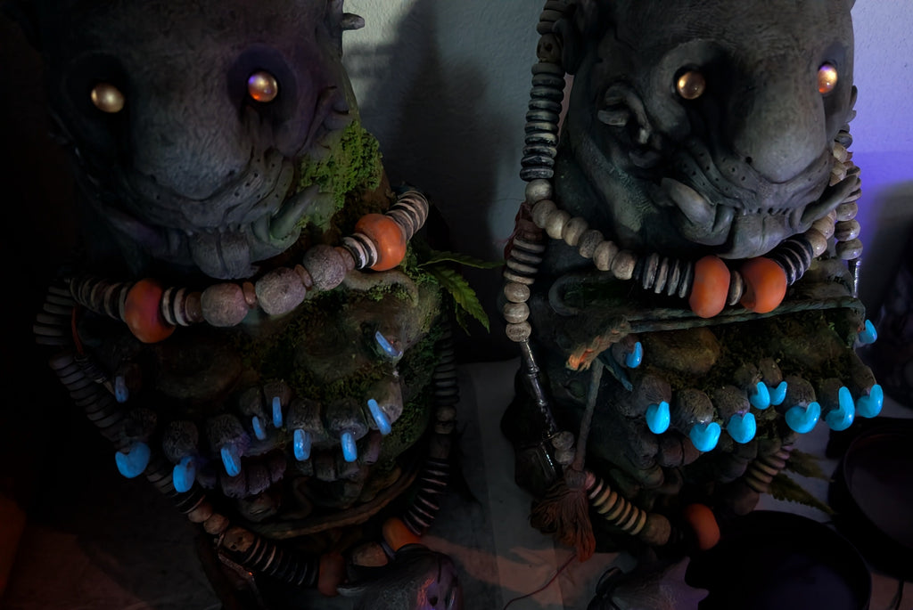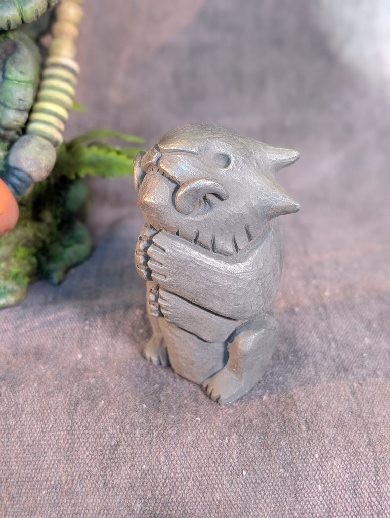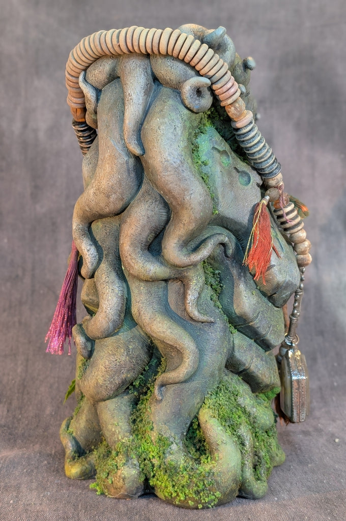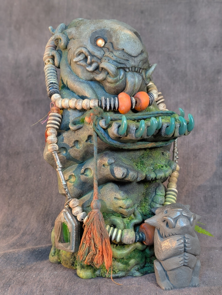 The Waypoint Watcher is a 12" urethane hollow cast. It has been sculpted to look like stone but is not actual stone. This is a finished sculpture that is hand painted and decorated with faux moss/fern accents. The necklaces are made from bone, wood and glass beads.