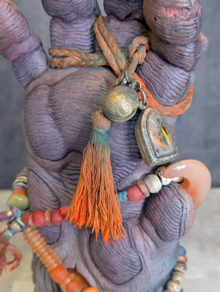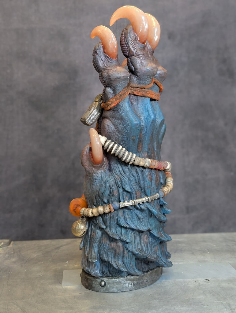 This is a 14" cast urethane sculpture. The original was sculpted in Monster Clay. This cast has been hand painted with acrylic with fabric cord, glass and metal beads adorning it. This one of a kind piece is ready to be displayed and will be a fine addition to your collection of monster relics.