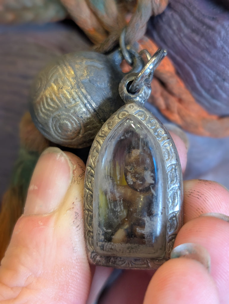 It has been adorned with strands of bone, wood and glass beads. It has a small reliquary pendant containing a parrot feather and a creepy baby charm. This paw had a hard life and bears scars!