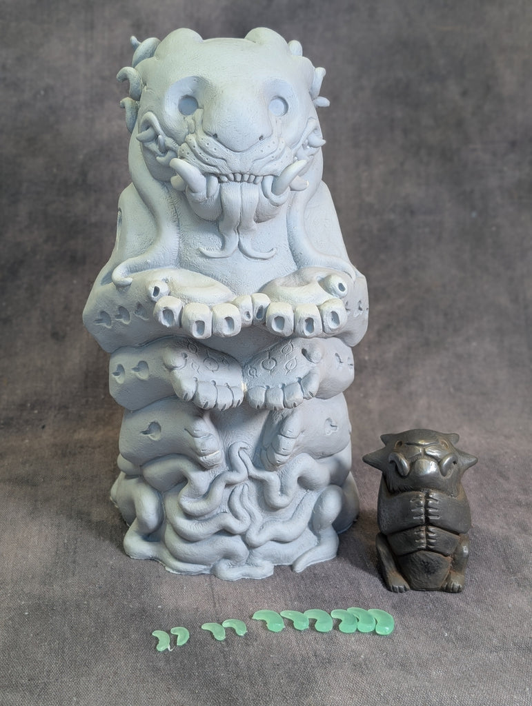 - This is for one (1) unfinished 12" grey hollow cast of the idol, one (1) unfinished cold cast iron 3.5" effigy cast, a set of ten (10) translucent glow in the dark green claws and two (2) glass half dome eye cabochons.