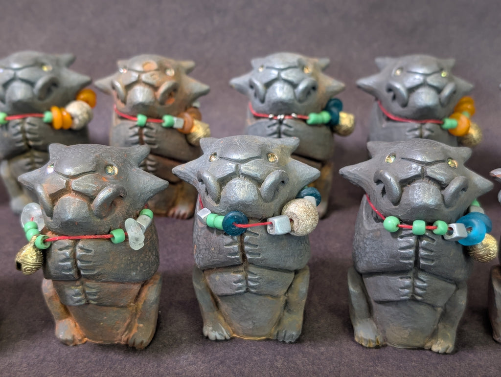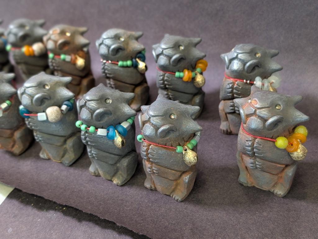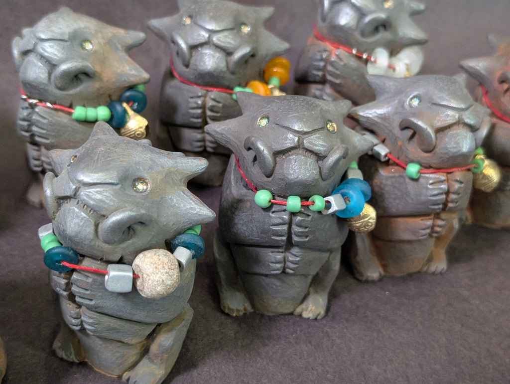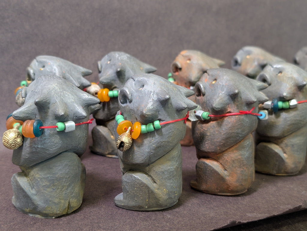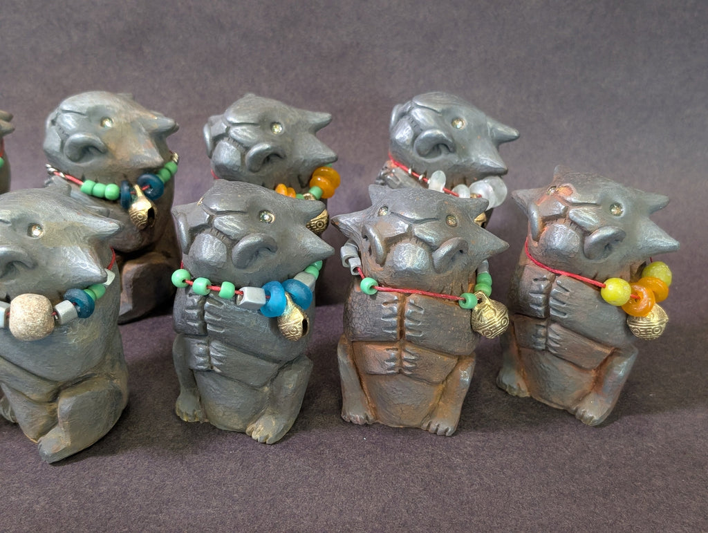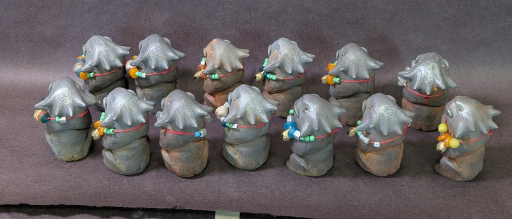 Each special figure has glass and metal beads, some with brass bells and some with Stegodon fossil beads. Each has a tiny sparkly glass pupil set into a gold eye.