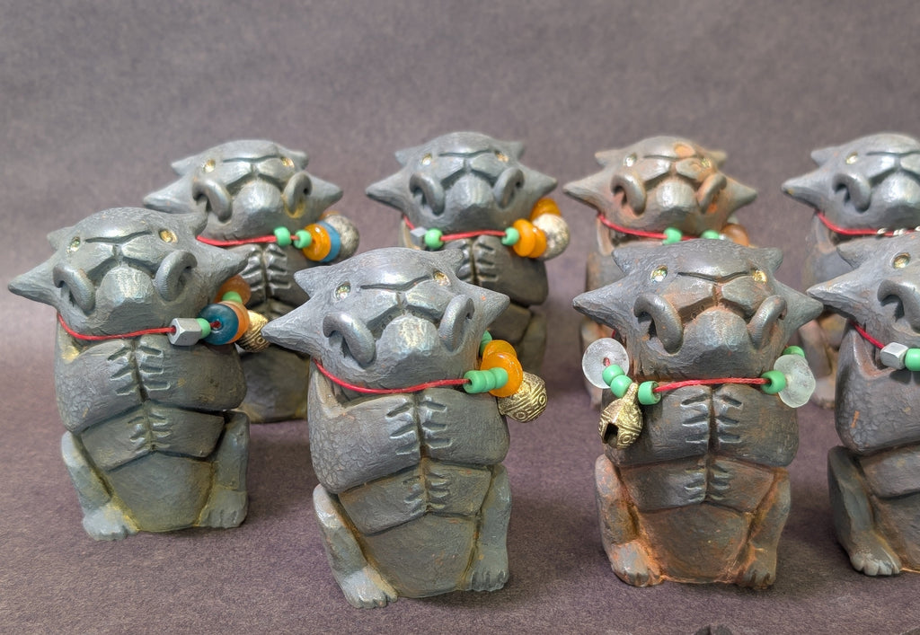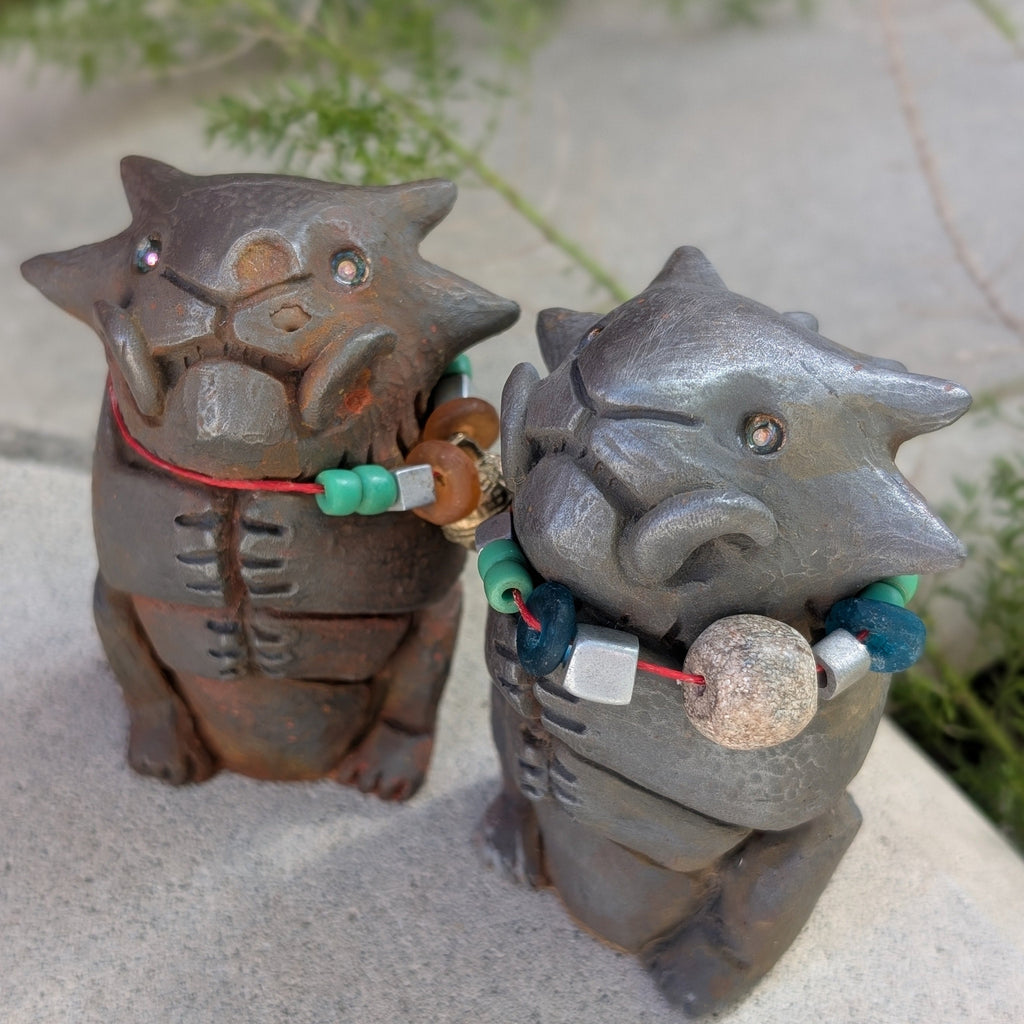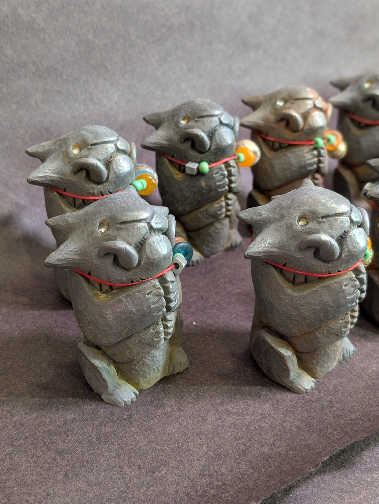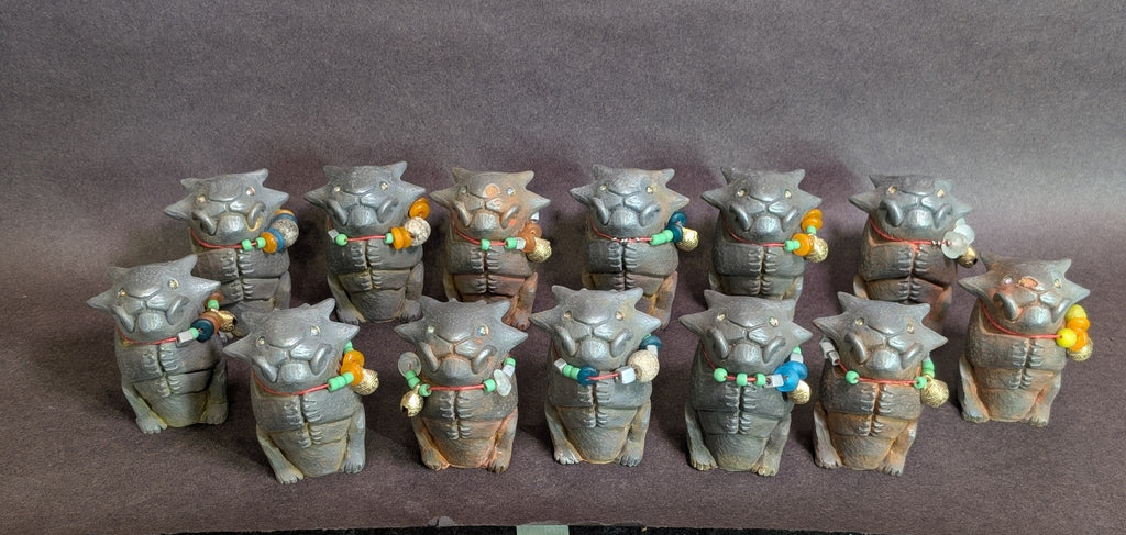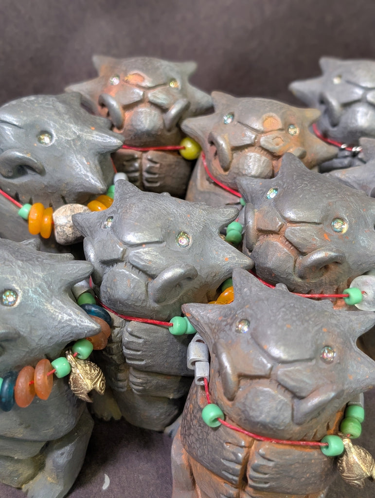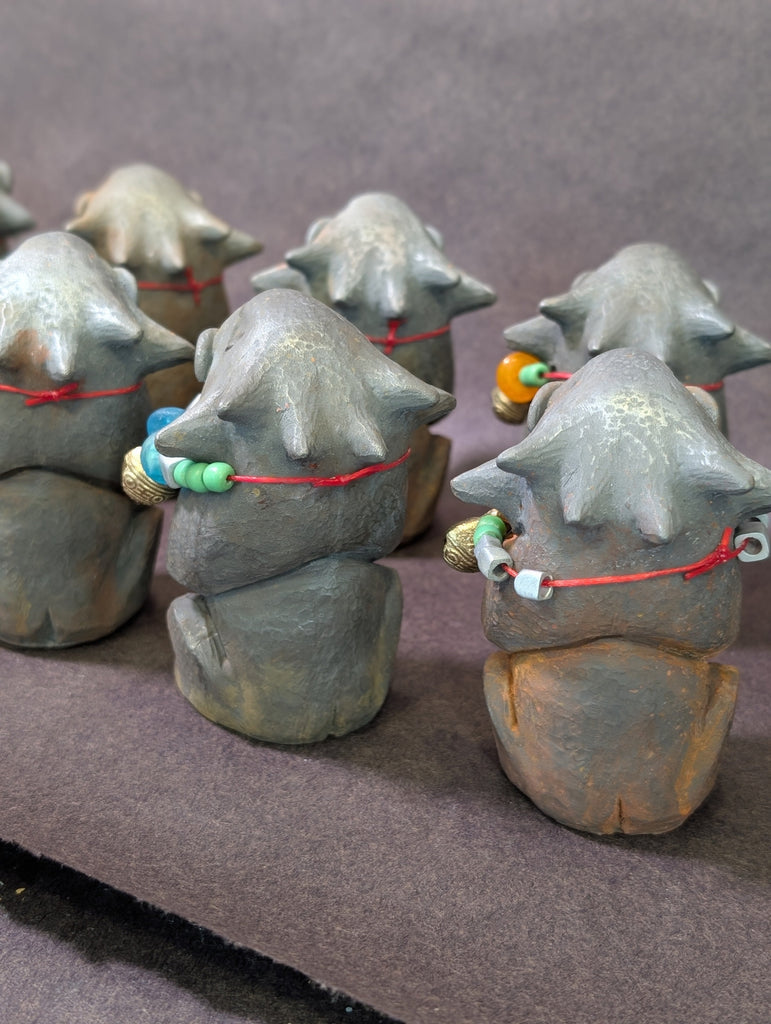 Each special figure has glass and metal beads, some with brass bells and some with Stegodon fossil beads. Each has a tiny sparkly glass pupil set into a gold eye.