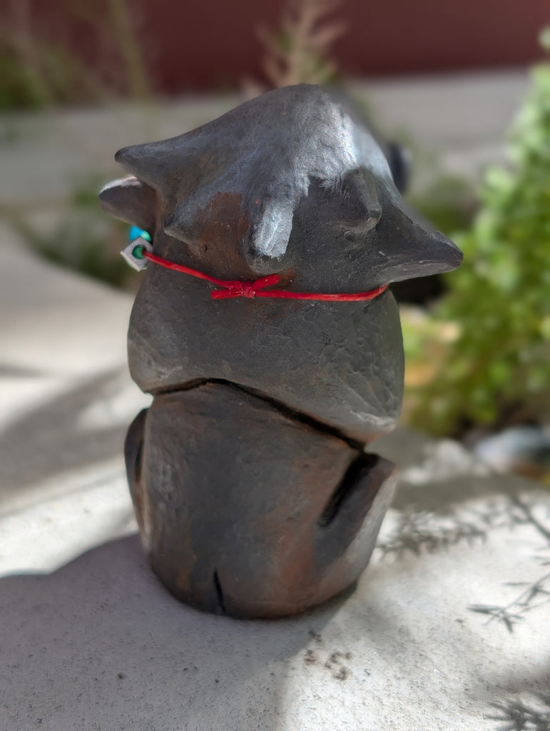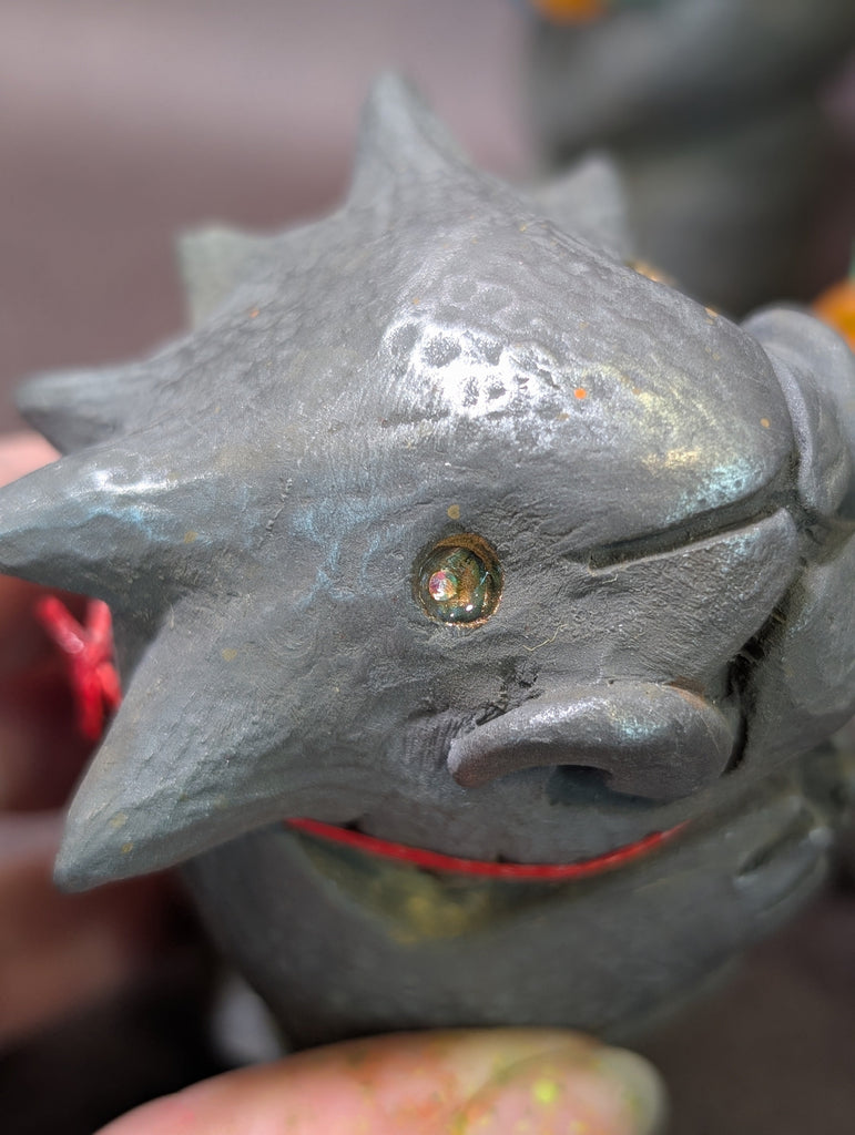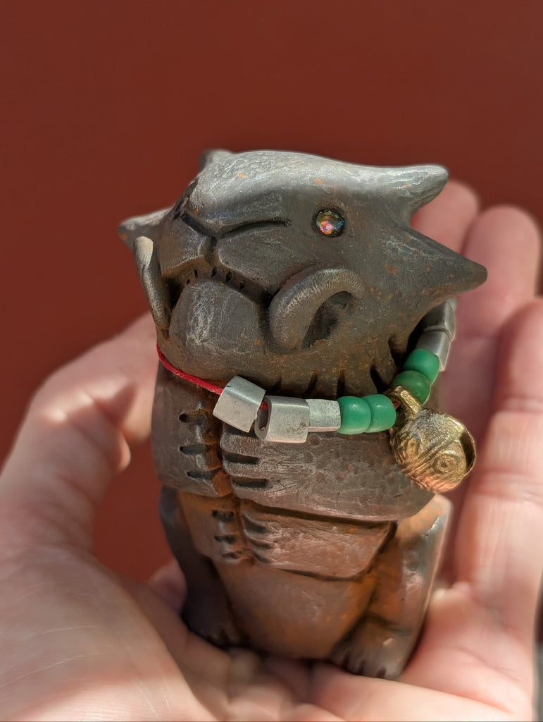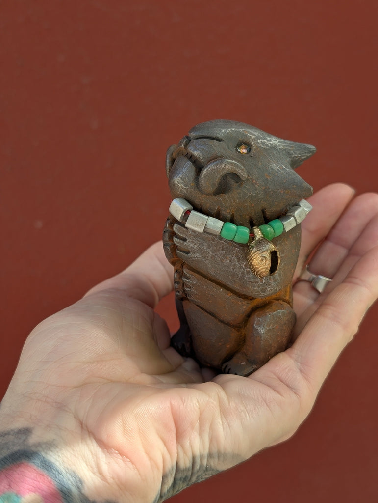 This is for a cold cast iron finished effigy figure. It feels heavy and cold to the touch like real metal but is a mixture of metal powder and urethane. Each one is weathered and decorated to be unique! These can be polished further with steel wool if the buyer prefers more shine.
