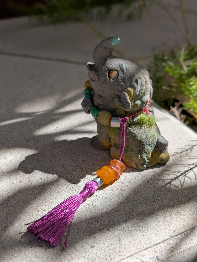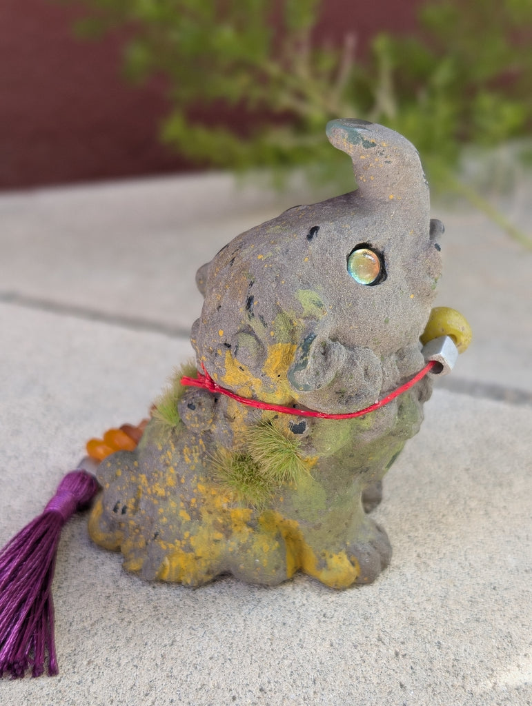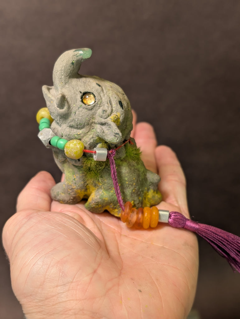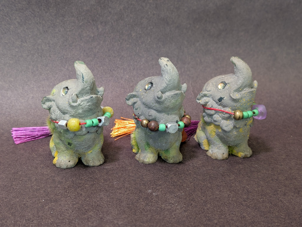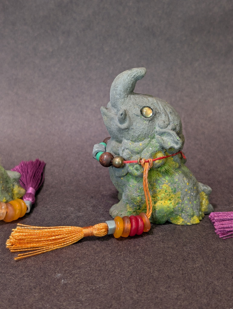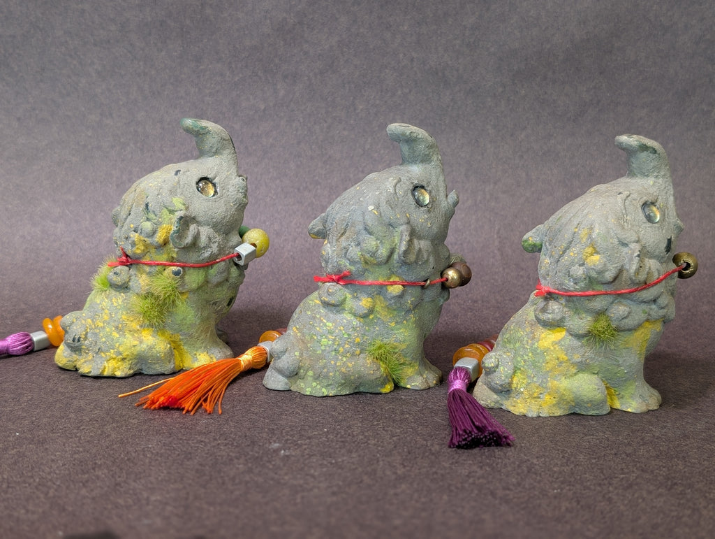 These 3.5 " finished figures were cast in urethane and coated in a real stone medium that makes the surface cold to the touch just like real stone! I added faux moss and paint to create a weathered effect. Each necklace is made of glass and metal beads. The eyes are reflective glass!