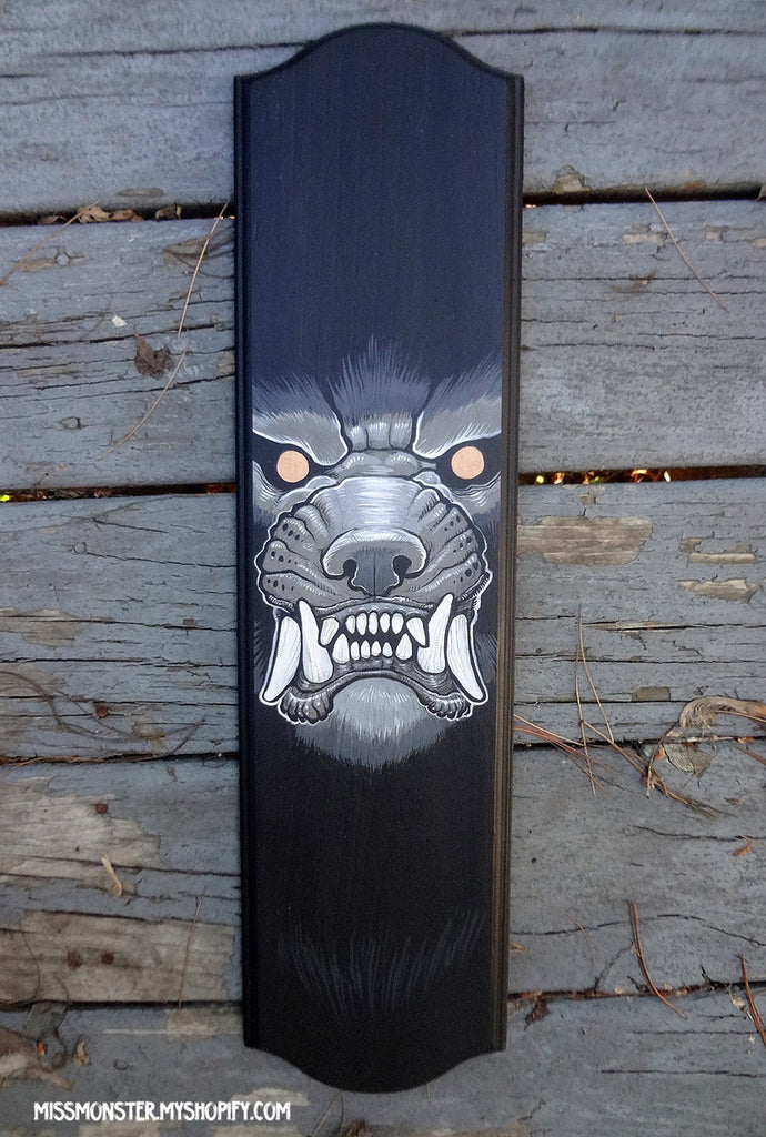 This is an original painting on wood. Ink and gouache. Reflective gold eyes.