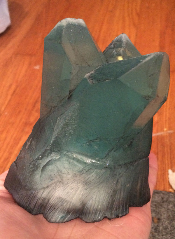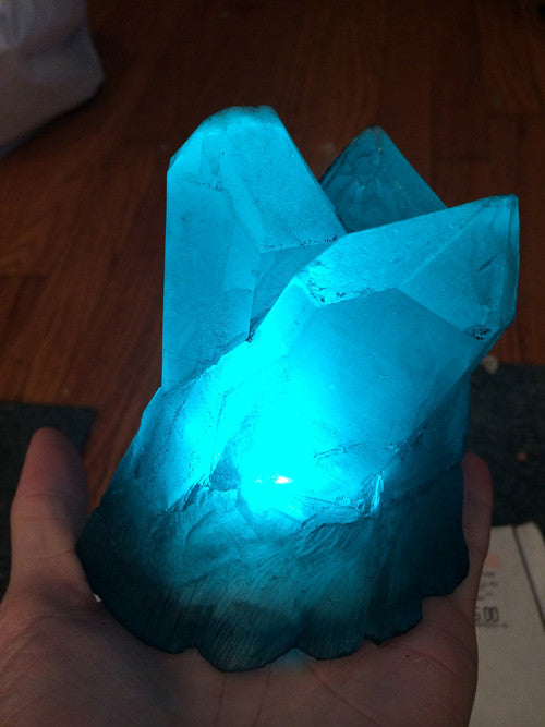 These small battery powered lights are cast in glow in the dark, translucent urethane. They have been cast from real quartz minerals with a sculpted base.