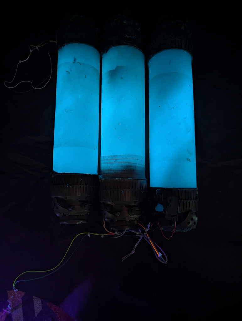 I made these to test out a new rotocast technique to use for light props at an outdoor themed event. These glow in the dark and can be lit up. The urethane is semi-flexible and some of the cast edges are thin on some parts but are holding up ok. I have kicked the shit out of them , they are pretty durable! You can see that wires have been pulled out during said shit kicking so two of the lights need repair, the one that lights up should probably be rewired...