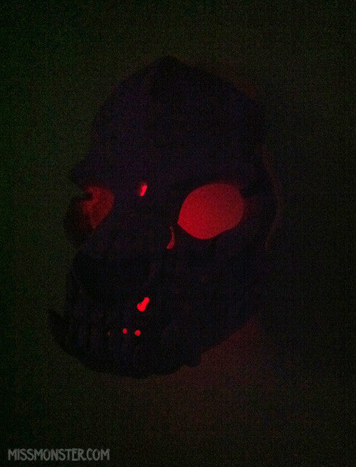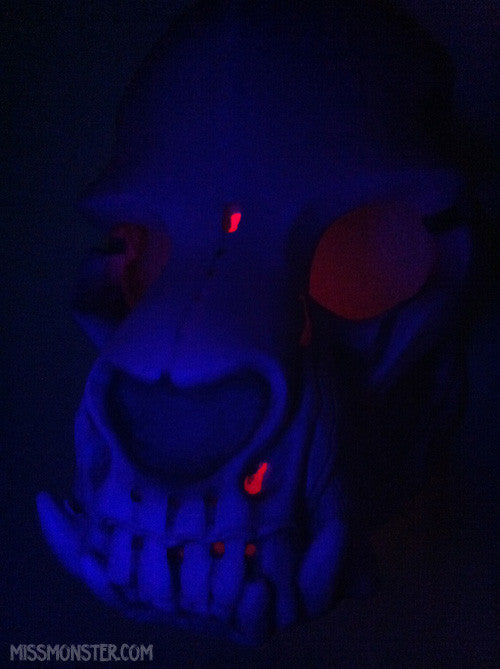 This cast urethane skull beast has been fitted with battery powered LED lighting. It hangs on the wall easily, giving off a soft red eerie glow. The skull itself has been cast with UV light reactive purple pigment so it glows under black lights. The battery pack on the back is easily opened to replace batteries and switch the light on and off.