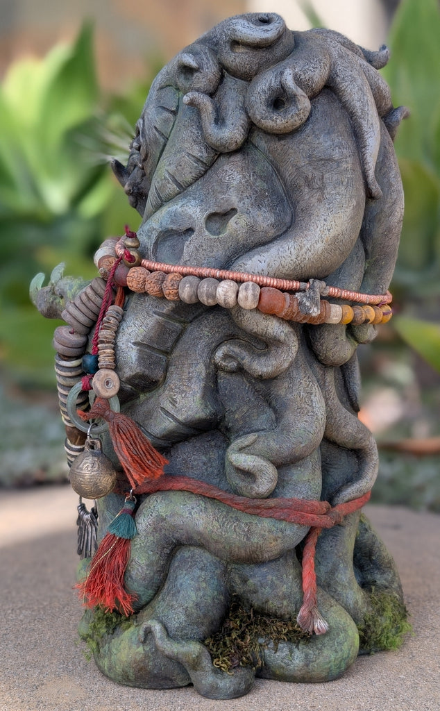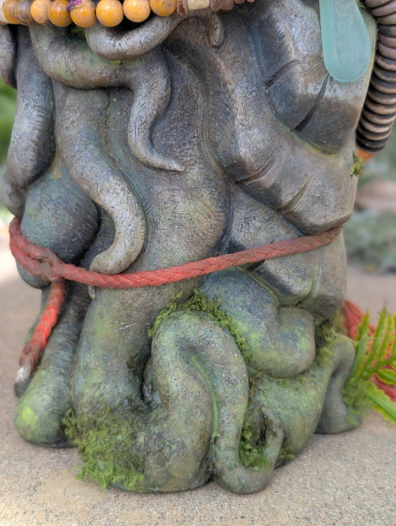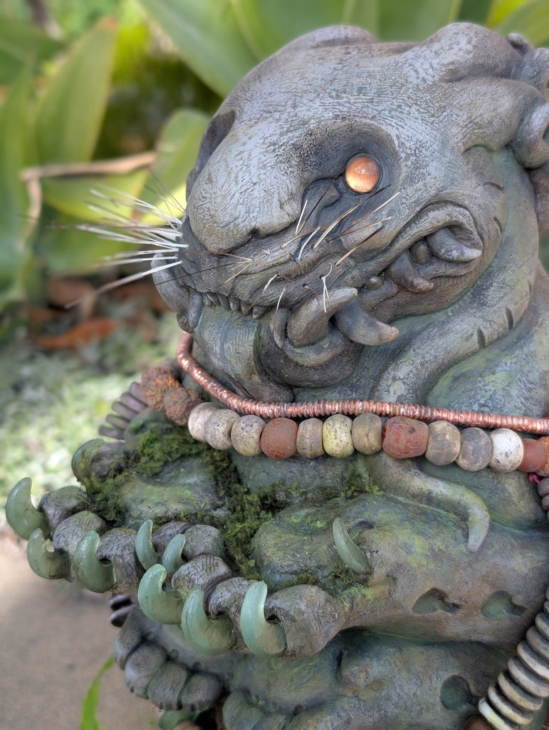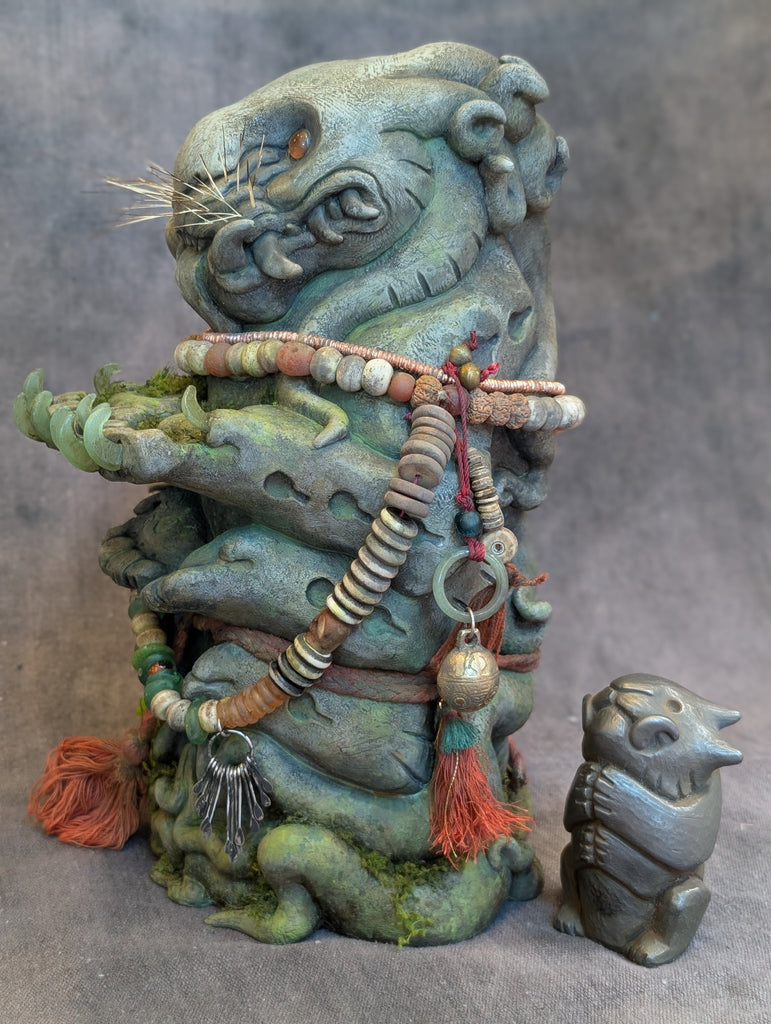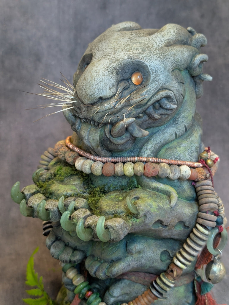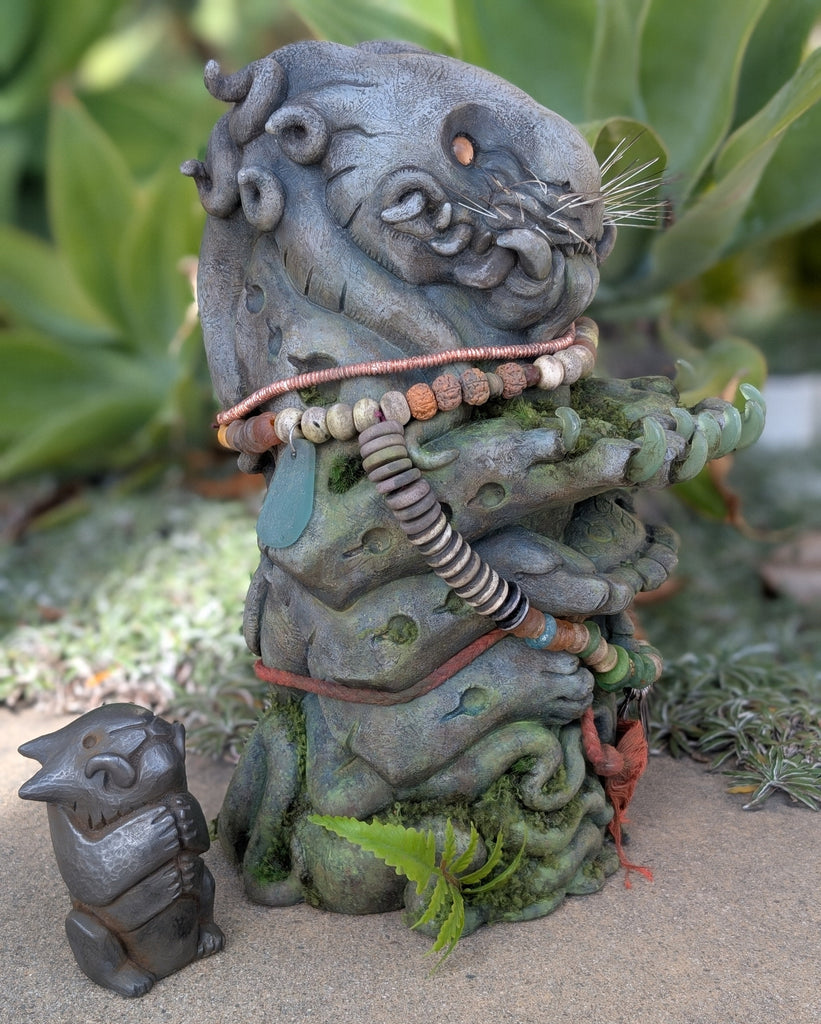 The Waypoint Watcher is a 12" urethane hollow cast. It has been sculpted to look like stone but is not actual stone. This is a finished sculpture that is hand painted and decorated with faux moss/fern accents. The necklaces are made from bone, wood and glass beads. The eyes are glass with a reflective gold backing.